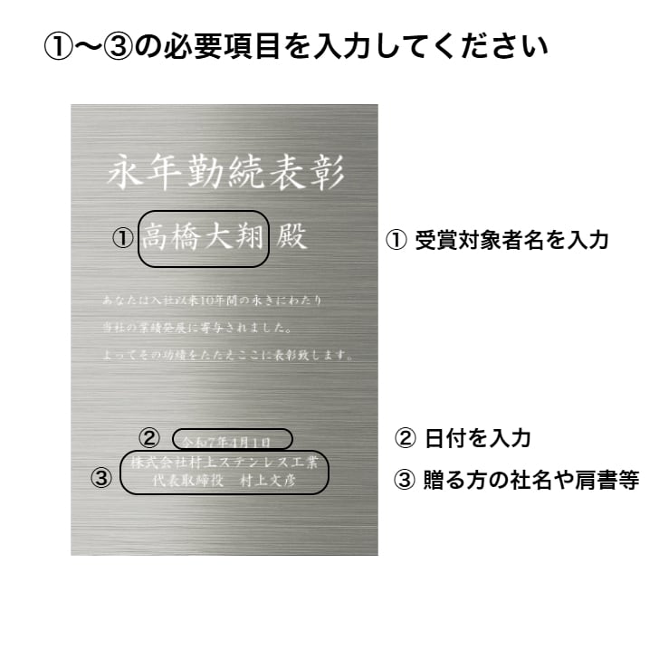 下記の①〜③に彫刻内容を入力後カートに入れてください。