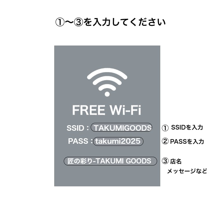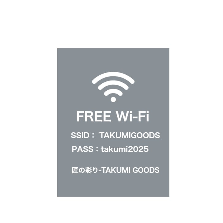Wi-Fiの利用を促進するためのどこでも設置できる「Wi-Fi案内プレート」は、シンプルでスタイリッシュなデザインが特徴です。お客様に快適なインターネット環境を提供し、店舗やオフィスで安心してWi-Fiを利用していただくための最適なアイテムです。