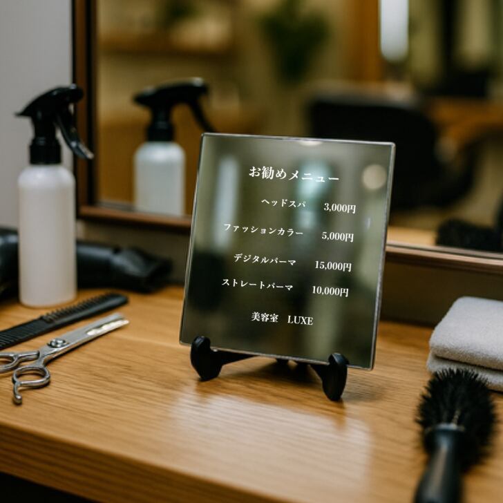 お好きなフリーワードを用いてカスタマイズできるフリーワード盾(鏡面)は、特別な演出をするための最適なアイテムです。販売促進用のインフォメーションを始め、様々なシーンで活用いただけます。